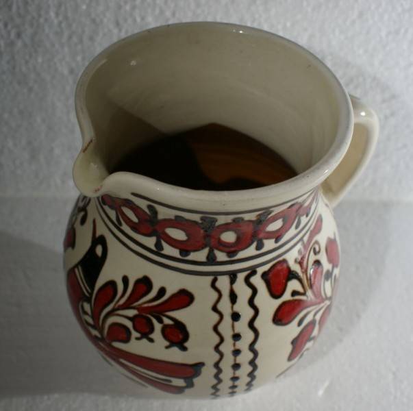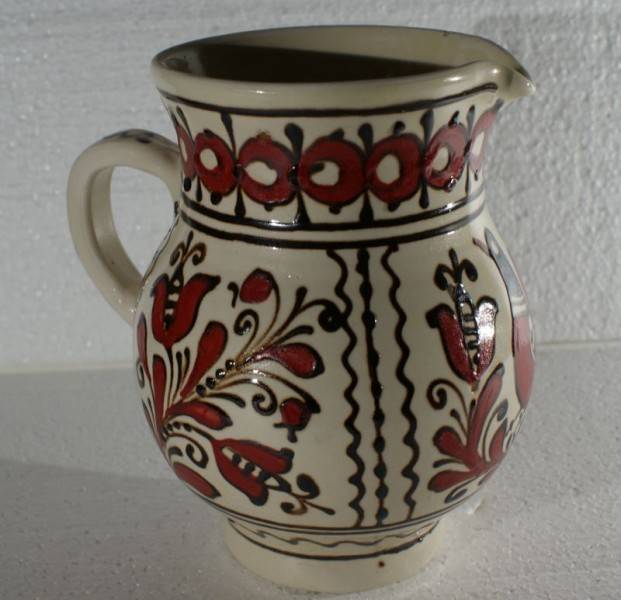 Cană mare, carafă, din ceramică modelată pe roata olarului și pictată cu motive specifice zonei Ardeal, Transilvania, flori, frunze sau păsări. Obiectul poate fi utilizat cu rol decorativ într-un spațiu aranjat în stil popular, rustic, dar poate fi folosit și ca atare, pentru servit în casă sau la restaurante cu specific românesc.