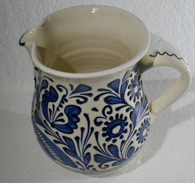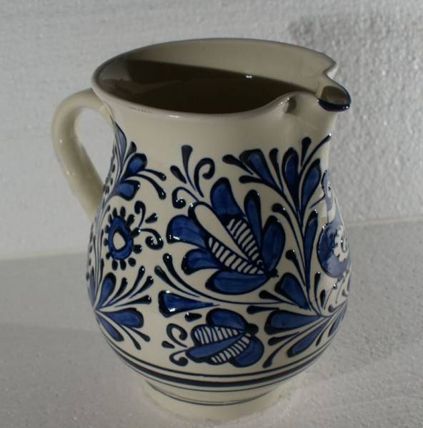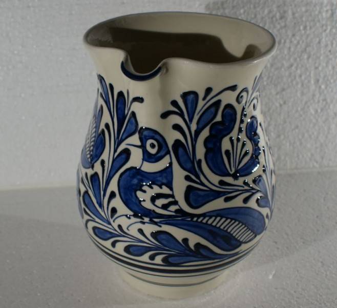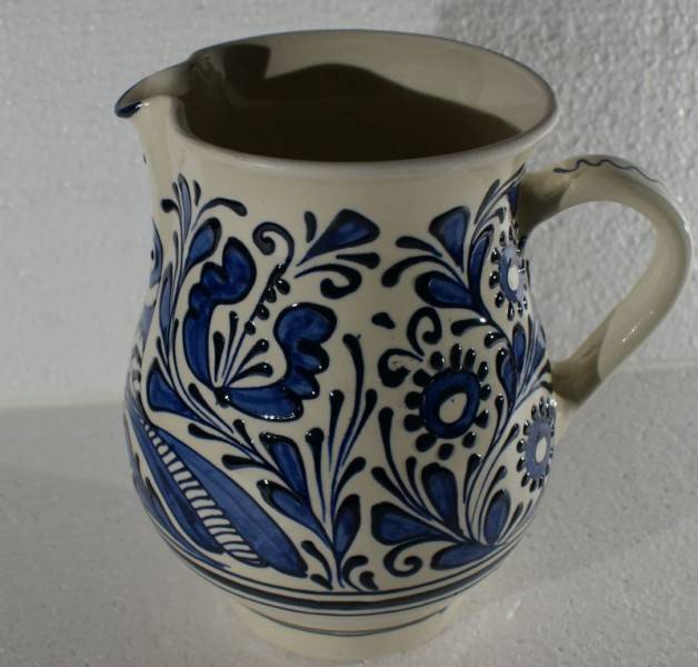 Cană mare, carafă, din ceramică modelată pe toata olarului și pictată cu motive specifice zonei Ardeal, Transilvania, flori, frunze sau păsări. Obiectul poate fi utilizat cu rol decorativ într-un spațiu aranjat în stil popular, rustic, dar poate fi folosit și ca atare pentru servit în casă sau la restaurante cu specific românesc.
