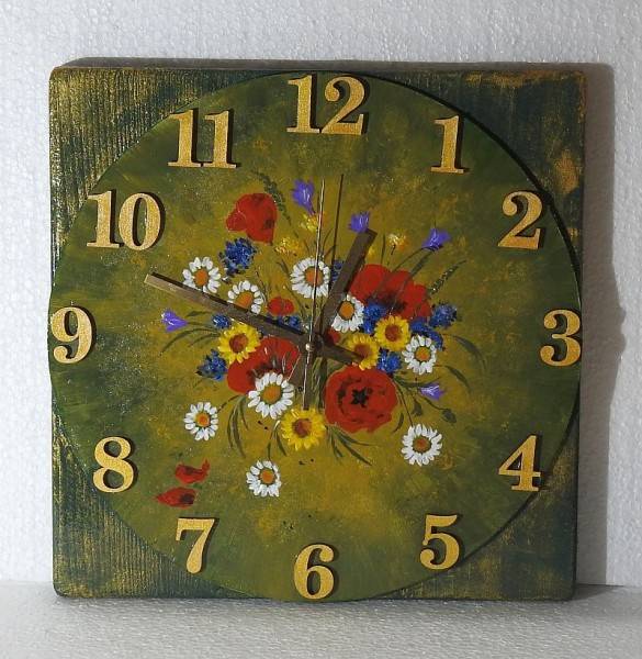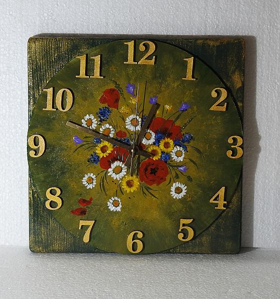 În centrul ceasului este pictat manual un buchet vibrant de flori de câmp, în culori vii: roșu intens (maci), alb (margarete) și accente de galben și albastru, oferind un aspect natural și vesel. Cifrele arabe sunt mari, bine evidențiate, în tonuri aurii, ceea ce asigură o citire ușoară a orei și un contrast elegant cu fundalul.