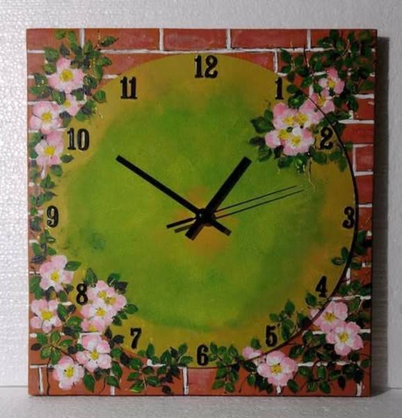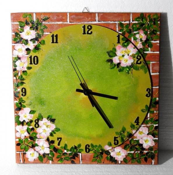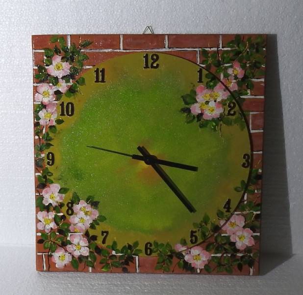 Ceas pictat manual pe lemn, în culori Tempera, Flori de măceș ce urcă pe un zid de cărămidă.