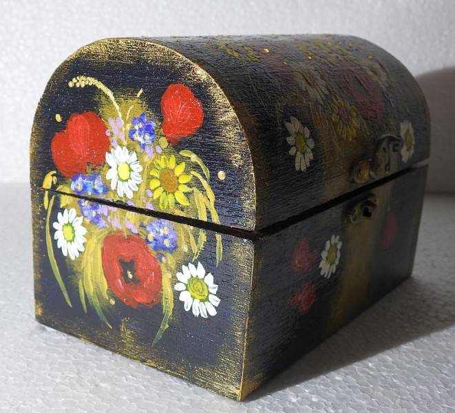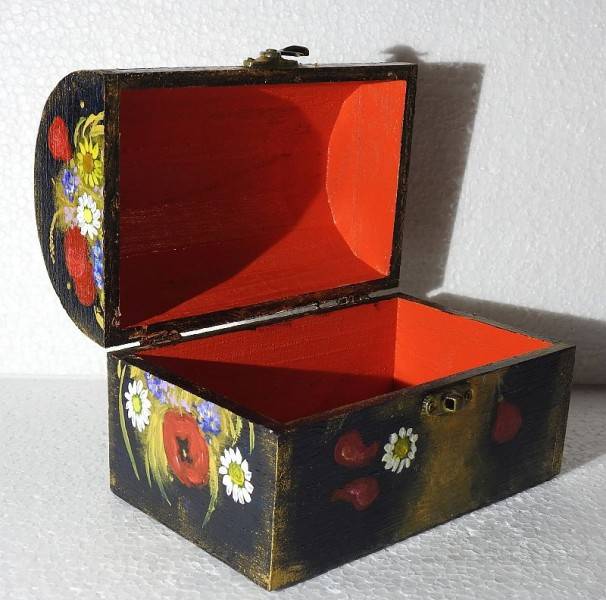 Caseta este grunduita si vernisata. Cufarul dispune de inchizatoare si balamale metalice. In el puteti depozita amintiri de la nastere si botez, de la cununie (marturii), bijuterii si obiecte mici, de suflet.