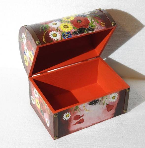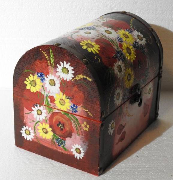Caseta este grunduita si vernisata. Cufarul are inchizatoare si balamale