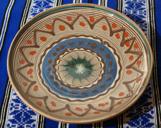 Farfurie din lut, lucrată manual, foarte îngrijit, pe roata olarului. Este autentică, pictată cu motive tradiționale românești, din regiunea Vâlcea, Oltenia. Obiectul este rodul muncii meșterilor populari din zonă, după o tehnică veche de peste 2000 de ani, ars în cuptoare speciale pentru lut și smălțuit. Printre cele mai cunoscute modele se numără: spicele de grâu, cocoșul, porumbița, spirala vieții, peștii, șarpele casei, sămânța, fiecare reprezentând simboluri arhaice, a căror semnificație s-a transmis din generație în generație. Farfuria are pe spate un sistem de agățat pe perete. Fiecare model este unicat. Ceramica de Horezu se află în patrimoniul UNESCO.