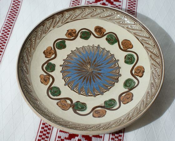 Farfurie din lut, lucrată manual, foarte îngrijit, pe roata olarului. Este autentică, pictată cu motive tradiționale românești, din regiunea Vâlcea, Oltenia. Obiectul este rodul muncii meșterilor populari din zonă, după o tehnică veche de peste 2000 de ani, ars în cuptoare speciale pentru lut și smălțuit. Printre cele mai cunoscute modele se numără: spicele de grâu, cocoșul, porumbița, spirala vieții, peștii, șarpele casei, sămânța, fiecare reprezentând simboluri arhaice, a căror semnificație s-a transmis din generație în generație. Farfuria are pe spate un sistem de agățat pe perete. Fiecare model este unicat. Ceramica de Horezu se află în patrimoniul UNESCO.