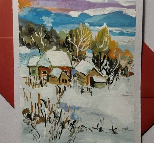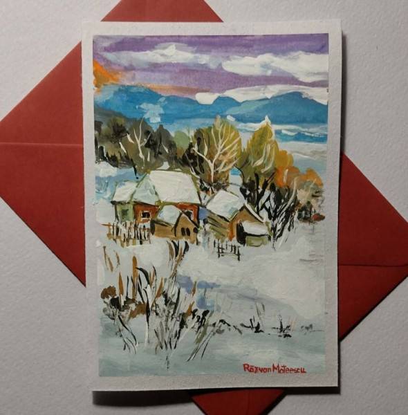 Lăsați-vă purtați de farmecul unui apus liniștit într-un peisaj de iarnă, surprins cu măiestrie în această felicitare pictată manual. Cerul se înroșește treptat, lumina blândă se așterne peste zăpadă și copaci îmbrăcați în alb, creând o atmosferă caldă și reconfortantă, chiar și în cele mai friguroase zile. Fiecare pensulă aduce detaliu și suflet scenei, realizată în culori tempera și protejată cu un lac special împotriva razelor UV, pentru ca frumusețea apusului să rămână vie pentru mult timp. O felicitare pictată manual nu este doar un simplu cadou, ci o emoție oferită celor dragi – un gest plin de rafinament, nostalgie și eleganță. Această mică operă de artă poate însenina ziua destinatarului și rămâne o amintire prețioasă, păstrată cu drag. Fiecare felicitare pictată postată pe Artizanescu.ro are valoare de unicat. La comandă, putem executa modele în funcție de preferința clientului. Dimensiuni: felicitare 11,5 x 14,5 cm, plic: 12 x 16 cm.