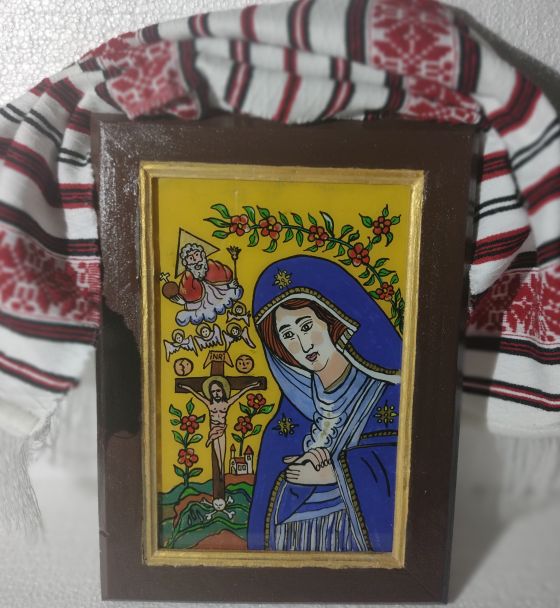 Icoană pictată manual pe sticlă în culori tempera Sankt Petersburg, cu emulsie de gălbenuș de ou și foiță de aur lichid, imagine inspirată din vechi izvoade transilvane, Școala de la Nicula. Obiectul este realizat cu respectarea în totalitate a canoanelor și metodelor tradiționale ale vechilor iconografi. Rama este realizată din lemn de pin antichizat, dat cu baiț ecologic și lac.