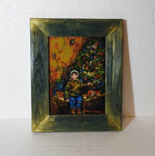 Tabloul surprinde o scenă de iarnă plină de căldură și emoție. În prim-plan se află un copil îmbrăcat gros, cu o căciuliță pe cap, stând pe marginea unei bănci din lemn. Copilul are expresie blândă, iar mâna lui se întinde ușor către bradul împodobit din dreapta. Bradul este bogat decorat cu globuri colorate și luminițe, răspândind o strălucire festivă care luminează încăperea.