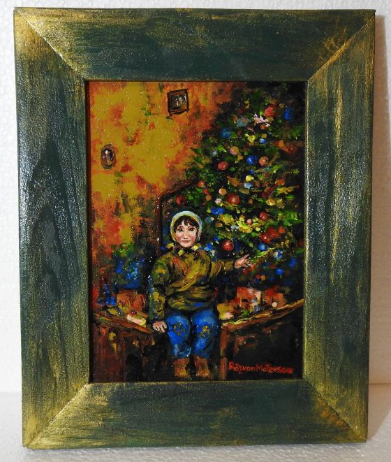 Fundalul are tonuri calde de portocaliu și maro, sugerând interiorul unei camere simple, dar primitoare, în care spiritul Crăciunului este prezent. Stilul picturii este expresiv, cu tușe groase și culori intense, iar rama verde cu accente aurii completează atmosfera nostalgică și tradițională a lucrării.