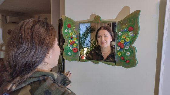 Oglindă pe suport din lemn masiv, traforat și pictat manual în culori Tempera cu maci și flori de câmp. Obiectul poate intregi decorul unui spațiu amenajat în stil popular tradițional. Lemnul este vernisat, pentru a proteja pictura, iar pe spate este dat cu baiț. Aripile sunt pictate si ep față și pe spate, pentru un efect sporit al decorațiunii. Dispune de o agațătoare metalica și 4 balamale pentru rabatarea aripilor și închidere.