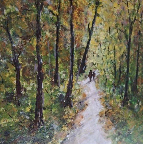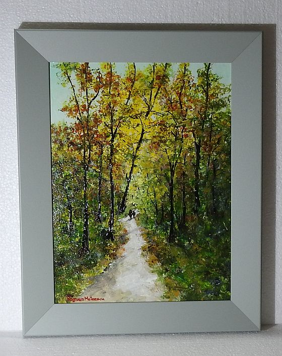 Acest tablou semnat de Răzvan Gabriel Mateescu surprinde o scenă poetică de toamnă, în care natura devine cadrul ideal al unei plimbări liniștite prin pădure. Compoziția este construită în jurul unei alei luminoase, care șerpuiește ușor printre copacii înalți, conducând privirea către un punct de profunzime ce sugerează mister și continuitate.
