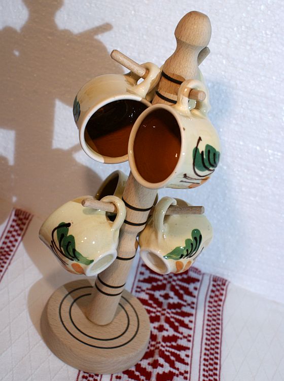 Set format din 6 canite din ceramica, pentru tuica, specifice zonei Transilvania, pictate manual cu modele florale. Cestile sunt asezate intr-un copacel de lemn. Obiectele sunt smaltuite si arse intr-un cuptor special pentru lut, la temperaturi de peste 1100 grade Celsius. Canile se pot folosi ca atare, dar si ca elemente decorative intr-un spatiu amenajat in stil popular, rustic, cabane vanatoresti, pensiuni, moteluri, crame.
