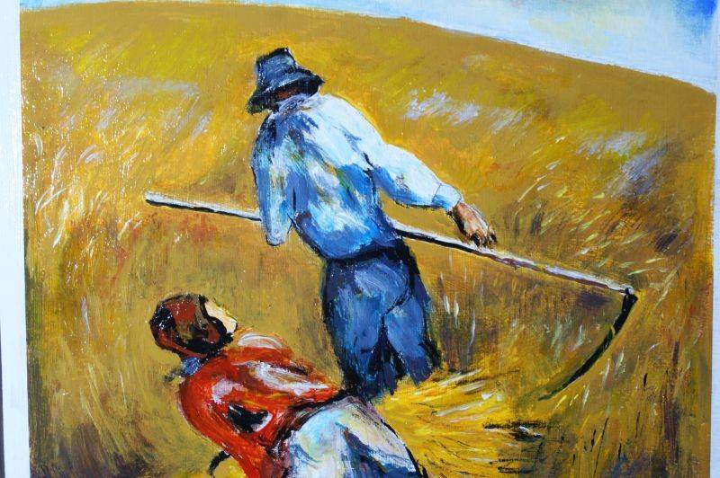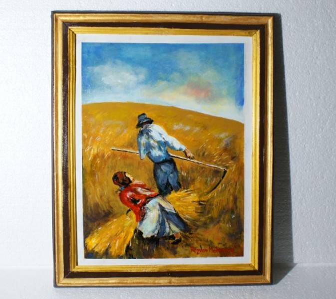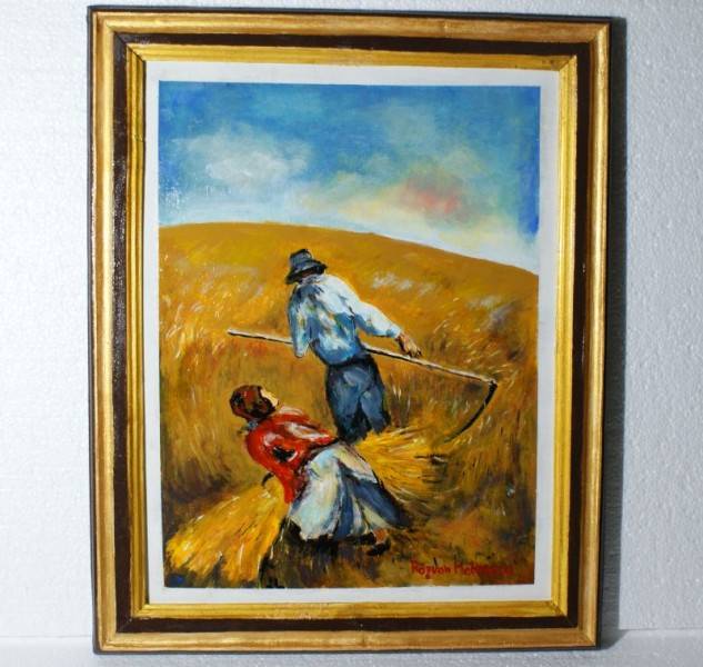 Tabloul, pictat manual pe lemn folosind culori tempera, înfățișează un peisaj plăcut, țăranii la cositul grăului. Un loc perfect pentru relaxare și contemplare, care invită privitorul să-și odihnească gândurile și să-și lase imaginația să călătorească. Pictura oferă un spațiu de meditație și visare, se simte mirosul grâului proaspăt și al viitoare pâini.