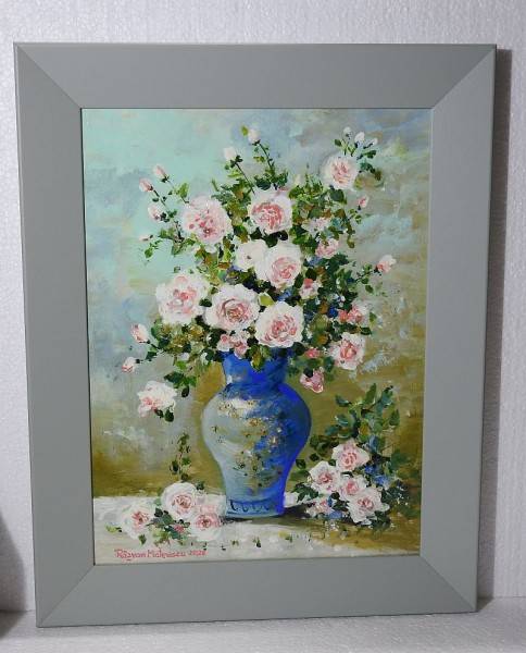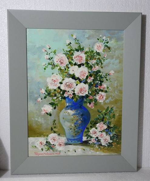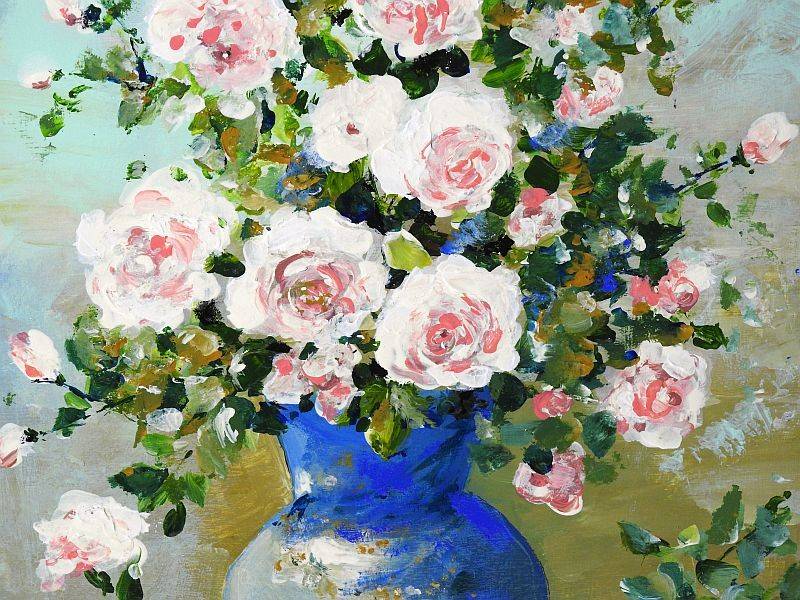 În centrul compoziției se află vaza, pictată în nuanțe intense de albastru, cu accente decorative aurii și albe, care îi conferă eleganță și profunzime. Din aceasta se ridică un buchet generos de trandafiri în tonuri variate de roz pal, alb și roz pudrat, înconjurați de frunze verzi proaspete și ramuri fine. Florile sunt pictate într-o manieră expresivă, cu tușe libere și vibrante, sugerând textura catifelată a petalelor.