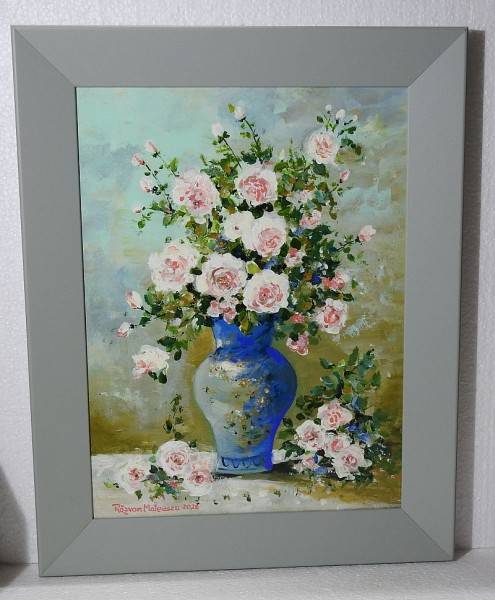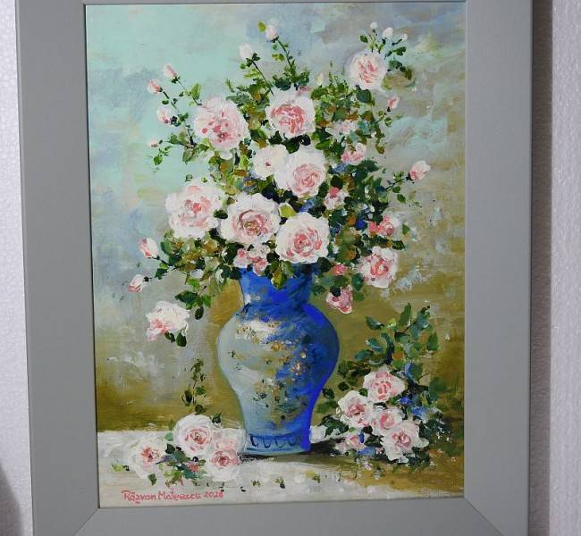 Tabloul realizat de pictorul Răzvan Mateescu, cu dimensiunile totale de 39 x 49 cm, prezintă o natură statică delicată și luminoasă, având ca element central un buchet bogat de trandafiri roz așezați într-o vază albastră decorativă.