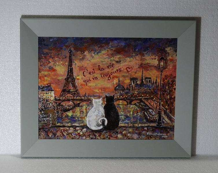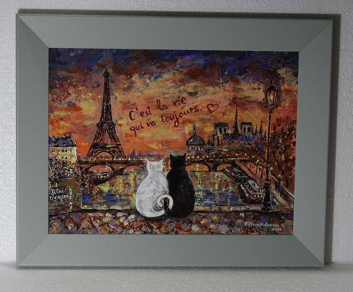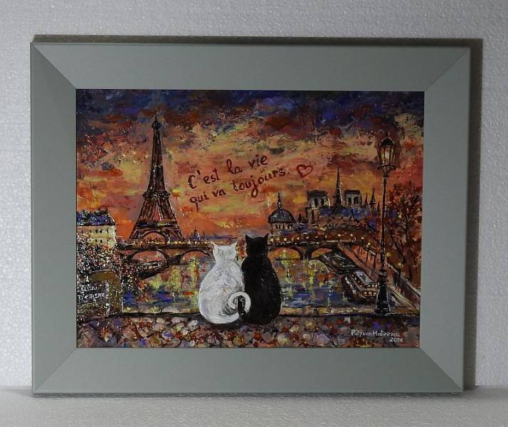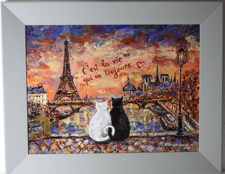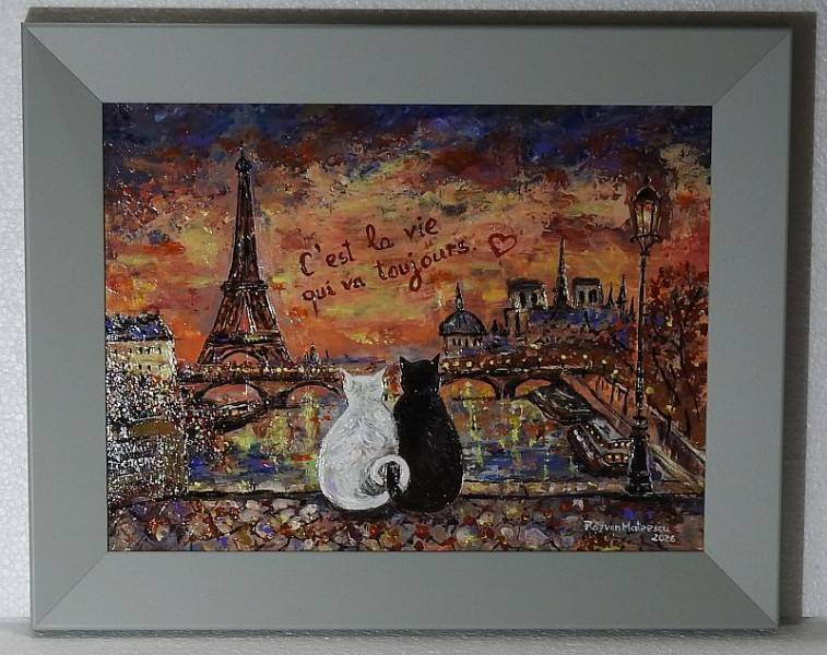 Tabloul semnat de Răzvan Mateescu este o reverie vizuală în care Parisul nu mai este doar un oraș, ci o stare de suflet. Sub un cer aprins, pictat în nuanțe vibrante de apus – rozuri, portocalii și accente de albastru profund – silueta elegantă a Turnului Eiffel veghează o scenă intimă și poetică. În prim-plan, două pisici, una albă și una neagră, stau alături, privind orașul ca și cum ar contempla însăși viața. Contrastul lor nu este întâmplător: ele devin simboluri ale echilibrului, ale dualității – lumină și umbră, început și sfârșit, inocență și mister. Textul scris de mână, „C’est la vie qui va toujours” („Viața merge mereu mai departe”), adaugă o dimensiune profund umană compoziției. Nu este doar o frază, ci o confesiune discretă, o mângâiere pentru suflet. Mesajul se așază peste oraș ca o promisiune: indiferent de ce a fost sau va fi, viața continuă. Tușele sunt libere, aproape impulsive, dar încărcate de emoție. Nimic nu este rigid – totul curge, pulsează, respiră. Podul, luminile, clădirile – toate par să se topească într-un vis colorat, ca o amintire frumoasă pe care nu vrei să o pierzi. Este un tablou despre liniște în doi, despre contemplare, despre acel moment rar în care nu mai ai nevoie de cuvinte. Doar privești… și înțelegi.