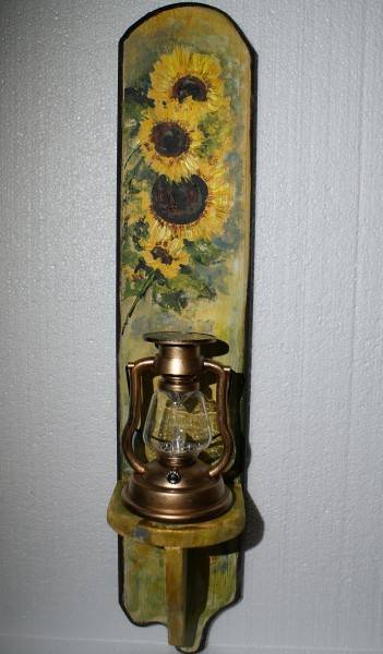 Suport rustic de perete, tip etajeră, realizat din lemn pictat manual, plus o lampă solară, cu baterie. Obiectele