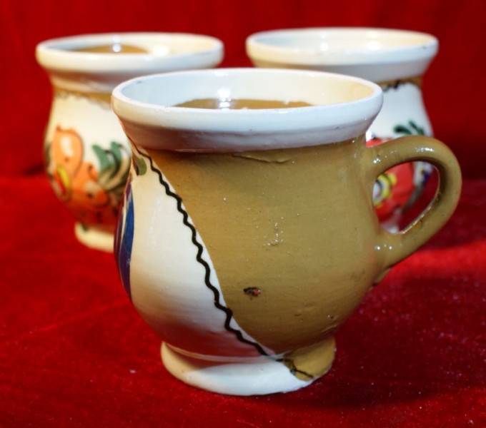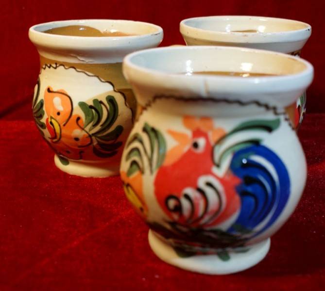 Cana voinica, traditionala, din ceramica glazurata, cu model floral sau cu pasare (cocos), pictata manual.