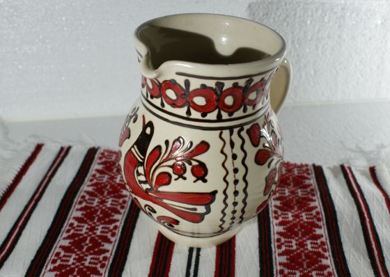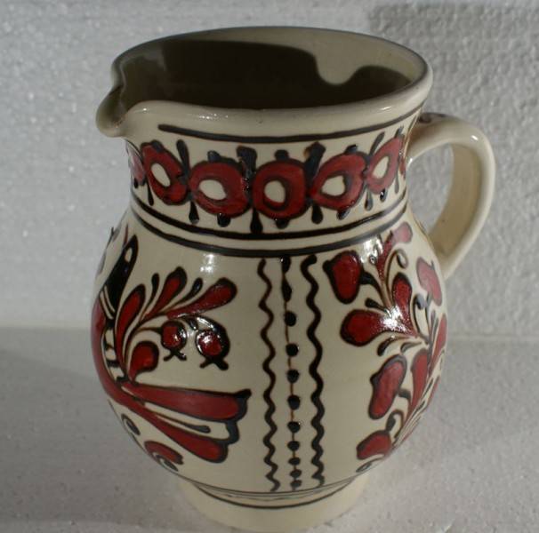 Cană mare, carafă, din ceramică modelată pe roata olarului și pictată cu motive specifice zonei Ardeal, Transilvania, flori, frunze sau păsări. Obiectul poate fi utilizat cu rol decorativ într-un spațiu aranjat în stil popular, rustic, dar poate fi folosit și ca atare, pentru servit în casă sau la restaurante cu specific românesc.