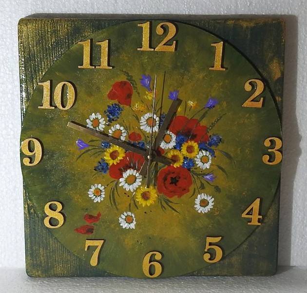 În centrul ceasului este pictat manual un buchet vibrant de flori de câmp, în culori vii: roșu intens (maci), alb (margarete) și accente de galben și albastru, oferind un aspect natural și vesel. Cifrele arabe sunt mari, bine evidențiate, în tonuri aurii, ceea ce asigură o citire ușoară a orei și un contrast elegant cu fundalul.