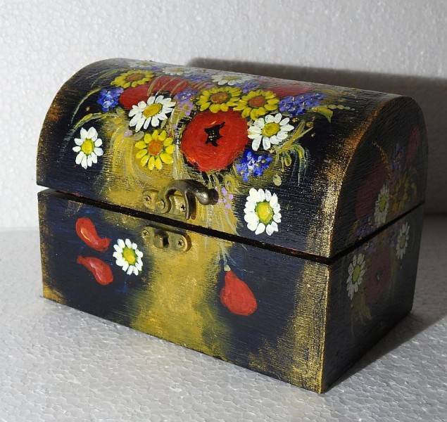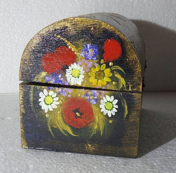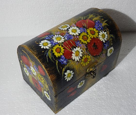 Caseta este grunduita si vernisata. Cufarul dispune de inchizatoare si balamale metalice. In el puteti depozita amintiri de la nastere si botez, de la cununie (marturii), bijuterii si obiecte mici, de suflet.