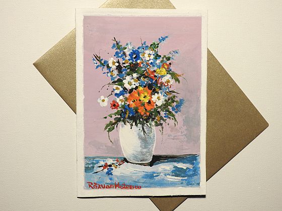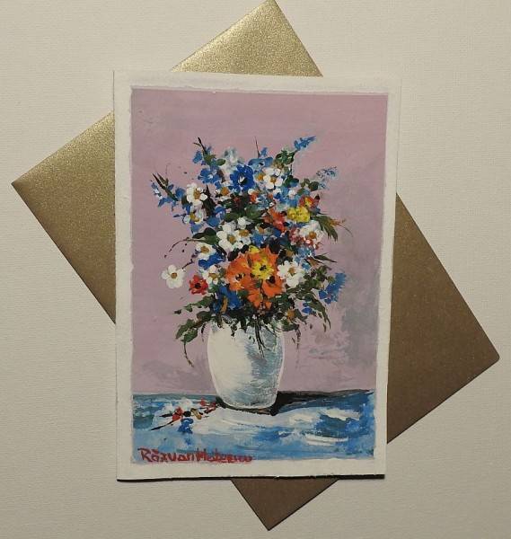 Felicitare pictată manual, reprezentând un buchet delicat de flori de câmp așezate într-un vas ceramic decorativ, pe un fundal violet ce pune în valoare culorile vibrante ale compoziției. Tușele expresive și armonia cromatică creează un contrast plin de viață între culorile elementelor vegetale, astfel că lucrarea transmite prospețime, naturalețe și bucuria lucrurilor simple, fiind o piesă unicat, realizată cu grijă și sensibilitate artistică. Ideală pentru a însoți un mesaj special sau pentru a fi oferită ca mic obiect de artă.
