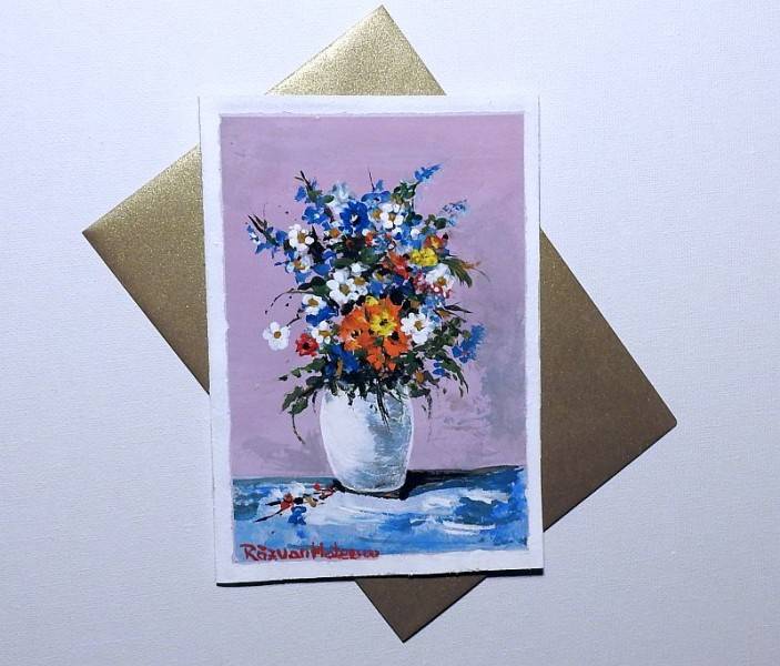 Felicitare pictată cu flori de camp in vază ceramică Felicitare pictată cu flori de camp in vază ceramică