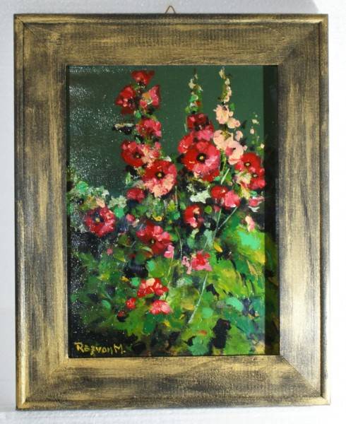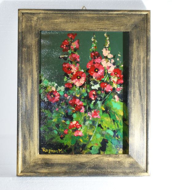 Pictura realizata manual pe panza din bumbac grunduita, in culori acrilice Studio si Maimeri, in rama din lemn masiv baituit, cu geam de protectie din material plastic, vernisata. In traditia populara, floare de nalba reprezinta victoria in fata greutatilor vietii, izbanda.