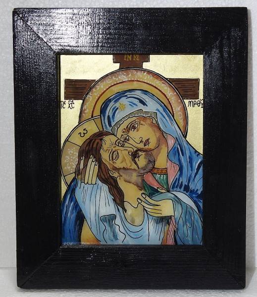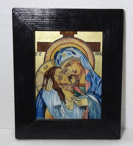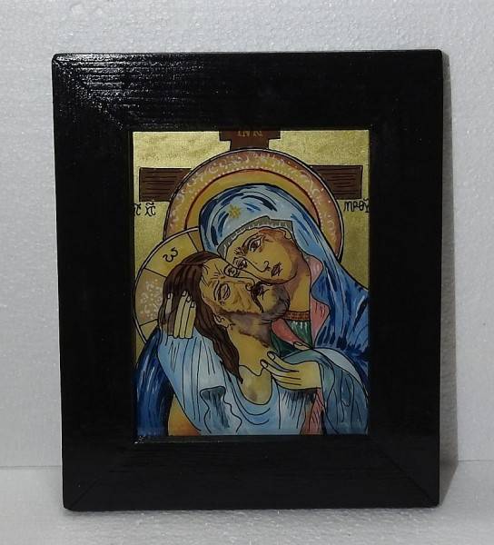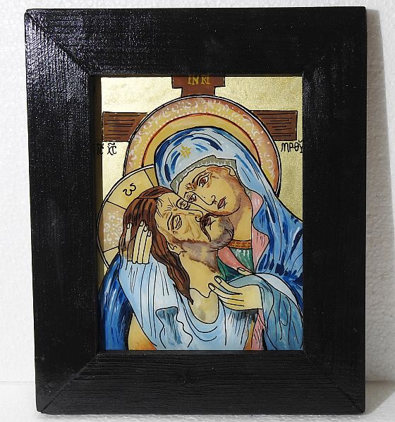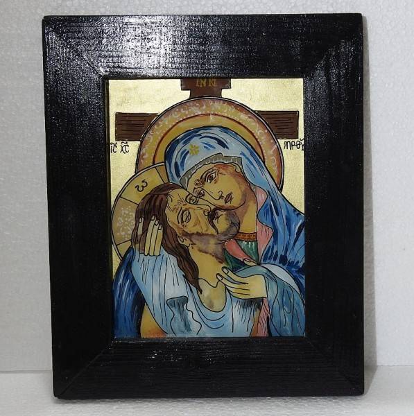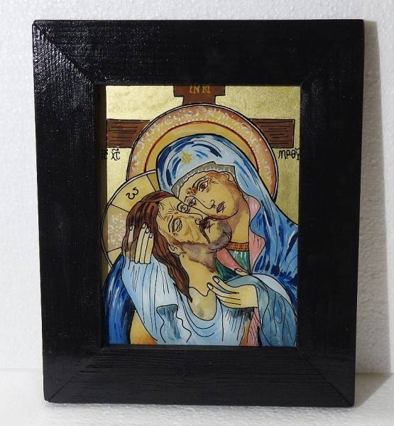 Icoană pascală pe sticlă, pictată manual prin tehnici tradiționale specifice școlii de iconografie de la Mănăstirea Nicula, realizată în culori tempera, cu foiță de aur și emulsie naturală pe bază de gălbenuș de ou. Lucrarea o înfățișează pe Maica Domnului îmbrațișandu-L pe Iisus, rastignit pe cruce – o compoziție cu puternică încărcătură spirituală, specifică perioadei pascale. Pictura este o viziune poprie a autorului.