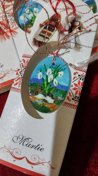 din ceramica alba, modelat si pictat manual, in culori acrilice, vernisat, cu diferite imagini inspirate din satul romanesc, flori sau personaje. Obiectul este prins in suport de carton cu snur bicolor traditional, alb, rosu. Fiecare martisor este unicat.