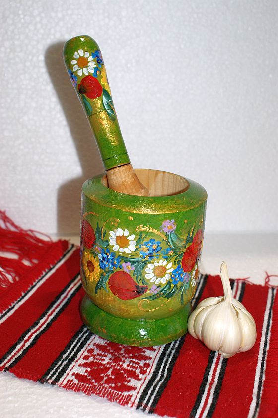 Descriere obiect Obiect decorativ tradițional, mojar din lemn cu pistil, pictat manual în culori acrilice, cu un finisaj lucios protector. Decorul este realizat în stil popular românesc, cu motive florale bogate: flori de câmp (margarete, maci, flori albastre), frunze și elemente vegetale stilizate, armonios integrate pe un fundal verde cald. Paleta cromatică este vie și echilibrată, cu accente de roșu, galben, alb și albastru, conferind obiectului un caracter rustic, vesel și autentic. Pictura este realizată manual, cu pensula, fiecare detaliu fiind unic, ceea ce face ca piesa să fie unicat. Mojarul este potrivit atât ca obiect decorativ pentru bucătării rustice, case de vacanță sau spații cu tematică tradițională, cât și ca piesă artizanală de colecție sau cadou cu specific românesc.