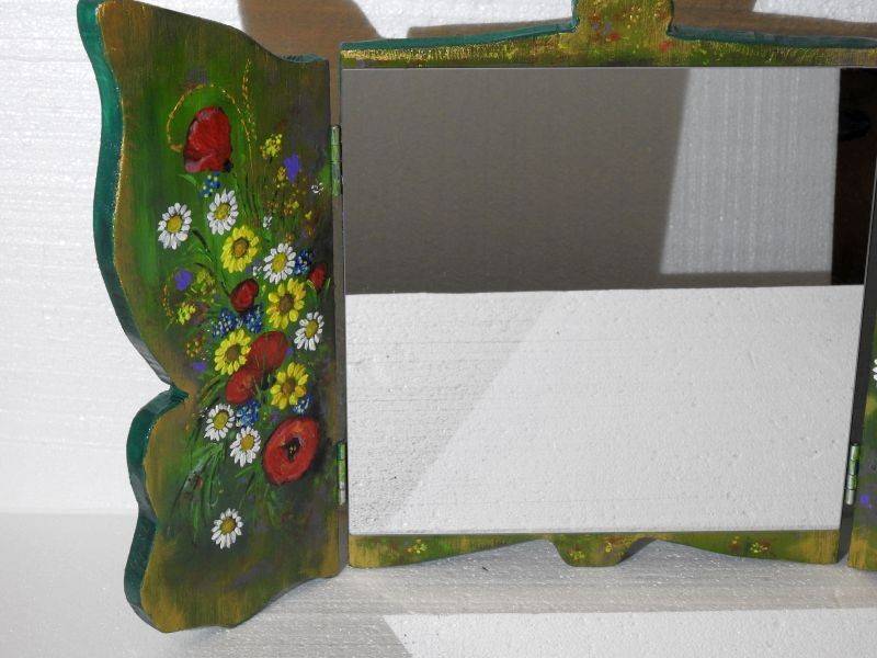 Oglindă pe suport din lemn masiv, traforat și pictat manual în culori Tempera cu maci și flori de câmp. Obiectul poate intregi decorul unui spațiu amenajat în stil popular tradițional. Lemnul este vernisat, pentru a proteja pictura, iar pe spate este dat cu baiț. Aripile sunt pictate si ep față și pe spate, pentru un efect sporit al decorațiunii. Dispune de o agațătoare metalica și 4 balamale pentru rabatarea aripilor și închidere.