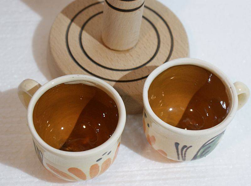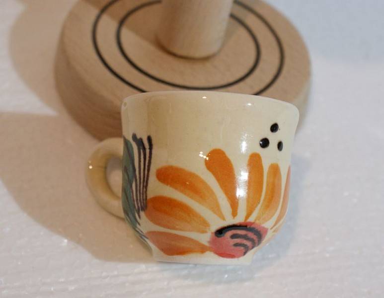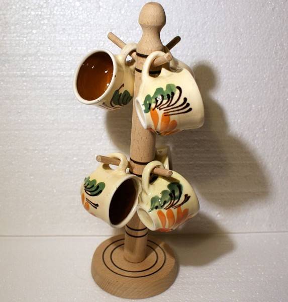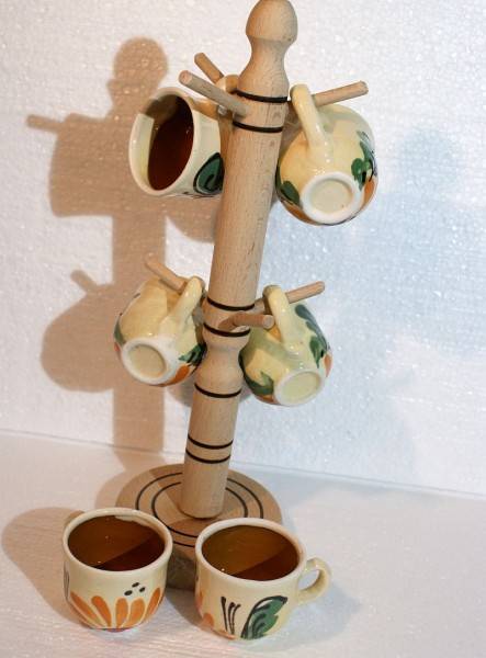 Set format din 6 canite din ceramica, pentru tuica, specifice zonei Transilvania, pictate manual cu modele florale. Cestile sunt asezate intr-un copacel de lemn. Obiectele sunt smaltuite si arse intr-un cuptor special pentru lut, la temperaturi de peste 1100 grade Celsius. Canile se pot folosi ca atare, dar si ca elemente decorative intr-un spatiu amenajat in stil popular, rustic, cabane vanatoresti, pensiuni, moteluri, crame.