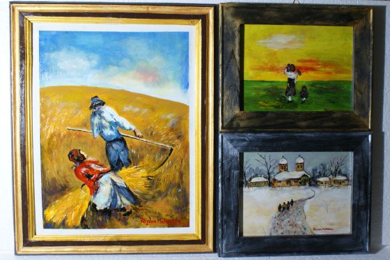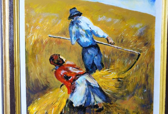 Tabloul, pictat manual pe lemn folosind culori tempera, înfățișează un peisaj plăcut, țăranii la cositul grăului. Un loc perfect pentru relaxare și contemplare, care invită privitorul să-și odihnească gândurile și să-și lase imaginația să călătorească. Pictura oferă un spațiu de meditație și visare, se simte mirosul grâului proaspăt și al viitoare pâini.