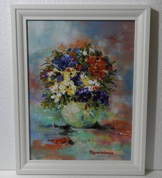 Pictură originală pe pânză întinsă pe carton, în culori Tempera. Numele de panseluță vine de la verbul francez „penser” - a gandi. Aceste flori simbolizează gingășia și delicatețea și în diferite culturi au o multitudine de semnificații. Panseluța înseamnă: mă gândesc la tine. Sunt simbolul meditației, amintirii și pasiunii. Se pot oferi în dar tuturor celor dragi. De asemenea, dăruind o panseluță înseamnă că empatizezi cu durerea și suferința cuiva. Legat de culori, movul reprezintă noblețea, regalitatea, roșul, iubirea, alb, puritatea, inocența, iar albastru, fideliatatea. Lucrarea este vernisată, înrămată și dispune de geam transparent din material plastic.